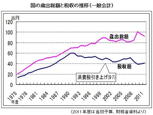 さらに根本的なことを言えば、今の増税論議で見落とされている点がある。実は増税しても税収は増えないということだ。なんだか理屈に合わないことを書いているなと思われる方もあるかもしれないが、下記のグラフを見ていただきたい。わが国の一般会計の税収額は1990年度ごろまでは年々増加していたが、1991年度以降は減少傾向が続いている。2009年度の税収額は約39兆円足らずで、ピークだった1990年度(60兆円余り)の3分の2以下に落ち込んだ。その後はやや回復しているが、それでも2011年度(当初予算)は41兆円と低迷したままだ。それに対して歳出額は増え続けており、税収とのギャップは鰐が大きく口を開いたように年々拡大している。その差額の大半が国債発行となっているわけだが、税収額の減少傾向が20年も続いているということが重大なのだ。この間、不況が続いていると言ってもそれなりに経済は成長していたわけで、その中で税収が20年間も減り続けているのは異常事態だとの認識があまりないように感じられる。