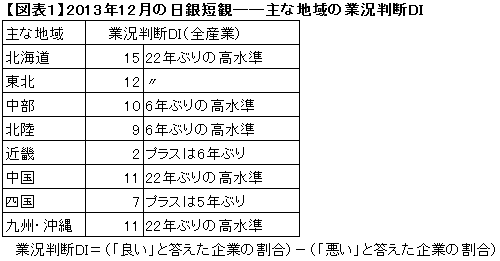 このDIは、「良い」と答えた企業の割合から「悪い」と答えた企業の割合を引いた数字で表わし、数字が大きいほど景況感が良いことを示しています。12月の結果は、アベノミクスによって企業の景況感が大幅に改善していることを裏付けたわけですが、中でも注目されるのは地方の改善です。