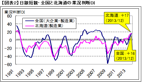特に好調なのが北海道と東北です。北海道の業況判断DI(全産業)はプラス15、東北は12で、いずれも1991年以来、実に22年ぶりの高水準を記録しました。そのうち北海道は製造業ではプラス17となり、製造業では全国を上回りました(図表2)。
