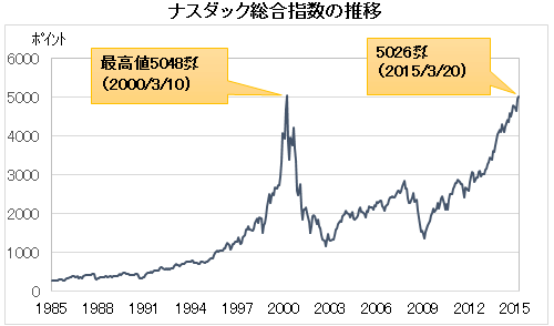 日経平均株価が15年ぶりの高値を更新して2万円の大台に迫っていますが、米国でも株価が最高値近い水準で推移しています。代表的な指数であるダウ平均もさることながら、IT企業などが多く上場しているナスダックの動きも注目です。ナスダック市場の動きを示すナスダック総合指数は3月2日、15年ぶりに5000㌽の大台を回復しました。その後は5000を割りましたが、3月20日に再び5000㌽に乗せ、2000年3月につけた最高値(5048㌽)にあと1歩まで迫っています。ちょうど日本の日経平均が同じく15年ぶりの高値ですので、日米の株価が歩調を合わせたかのようです。