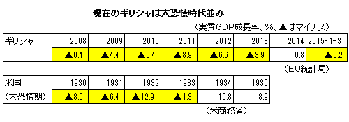 ギリシャは6年連続でマイナス成長となった後、2014年には0.8%増とわずかながらプラス成長になりました。しかし今年1-3月期は再びマイナス成長に逆戻りしており、このままなら今年は年間でもマイナス成長になる可能性が高くなっています。つまり現在のギリシャは大恐慌並みか、それ以下の経済状態とさえ言えるわけです。