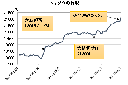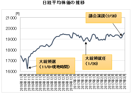 議会演説を受けて市場には安心感が広がり、株価は大きく上昇した。演説の翌日(3月1日)のニューヨーク市場でダウ平均株価は303㌦高の2万1115㌦となり、またまた史上最高値を更新した。この日の上げ幅は、昨年11月8日の大統領選後で最大だ。