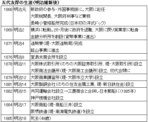 五代の交通業ビジネスは海運だけではなかった。1884年に大阪・難波と堺を結ぶ鉄道会社、阪堺鉄道を設立している。1885年12月に開業し、実質的は日本で初の私鉄となった(その後、同鉄道は南海電気鉄道に事業譲渡されている)。しかし残念なことに五代は開業を目前にした同年9月に亡くなっていた。享年49歳。