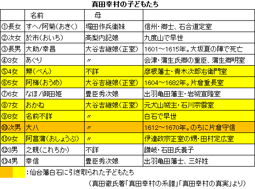 さらに驚くべきことに、幸村の他の子どものうち5人(1男・4女)が阿梅を追うように続々と仙台藩に逃れて来たのである。京などに隠れ住んでいた幼い子どもたちを真田家の旧臣たちがひそかに仙台藩まで送り届け、片倉家が居城の白石でかくまって養育した。まるで時代劇か何かのようだが、本当の話だ。
